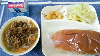 本日の給食は、担々麺にキャベツの甘酢づけとさくらんぼでした。