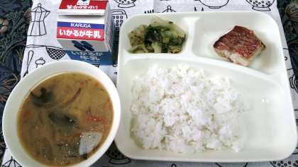 本日は赤魚のしょうゆだれかけに、なめこの味噌汁とおおさかしろなのごまあえでした。