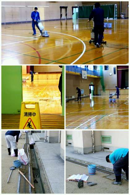 テスト期間をねらい、体育館の床を清掃し、ワックスをかけます。床の保護と安全のために大切な作業です。