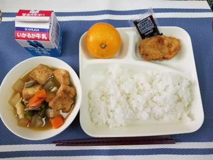 汁物は毎日が楽しみ。今日の『豚肉とあつあげの煮もの』についても、豚肉と大きくカットされたにんじん・だいこん・たまねぎがたくさん入っていました。
