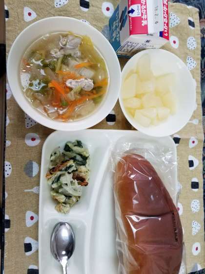 明日から2月です。3年生も給食がはじまります。明日のメニューは「いわしのしょうがじょうゆかけ」です。