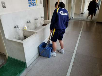 ハンドボール部の女子です。2階の廊下をきれいにモップをかけて磨いていました。