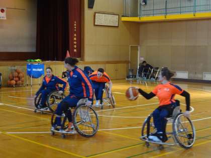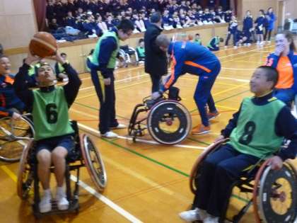 2コートに分かれ交流試合を行いました。オランダチームは3人。生徒は5〜6人で編成しましたが、力の差は歴然。しかし、勝ち負けよりもその交流に生徒は大興奮で笑顔が絶えません。