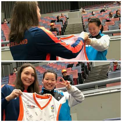 残念ながらオランダの試合は午前中だったため見れませんでしたが、 オランダの選手たちが観戦中の大淀中学校に挨拶に来てくれました。そこで オランダチームのメンバーから、先日のお礼としてサイン入りのユニフォームをいただきました。