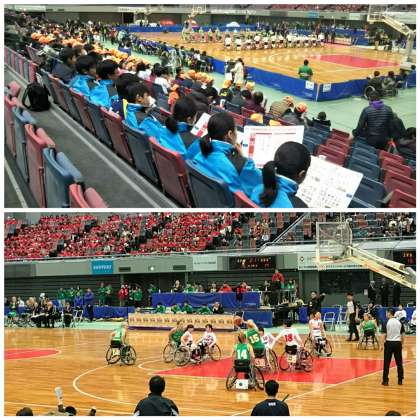 国際車椅子バスケットボール大会が大阪市中央体育館で開催されました。先日の交流会で本校に来ていただいたオランダチームが出場します。会場にはバド部8人、水泳部2人がその試合を観戦しに行って来ました。