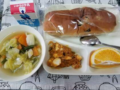 今日のスープはまた多くの食材が入り美味しかったですね。鶏肉に大きなにんじん、じゃがいも、キャベツが豊富に入っていました。
