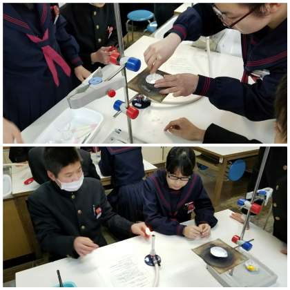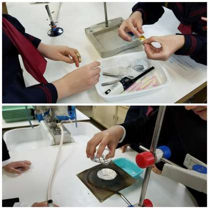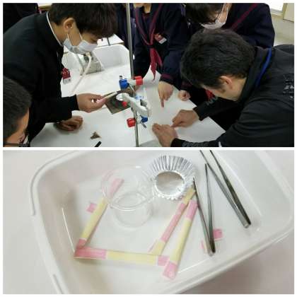 ガスバーナの使い方を学ぶ授業です。炎の大きさと火の色を調整する技術を学ぶというものです。炎を大きくして火力を上げれば良いというものでなく、適切な大きさと色があるようです。楽しい授業の中にきちんと知識と技術を学ばせる機会が入っていました。