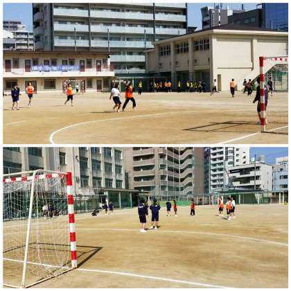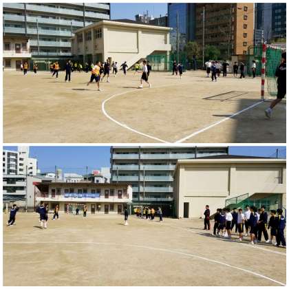 体育館が卒業式の会場になっているため、男女とも運動場で活動しています。