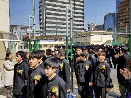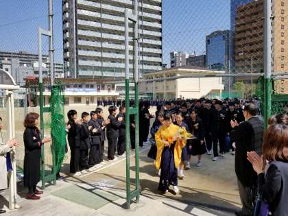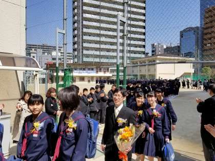 2組の担任先生を先頭に生徒が校門を後にしました。