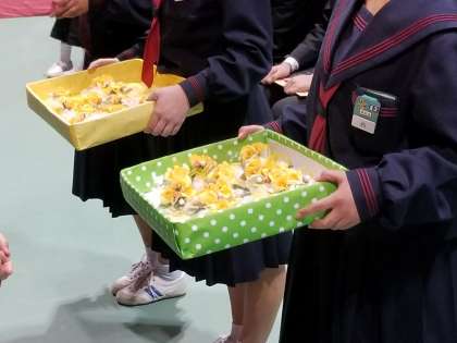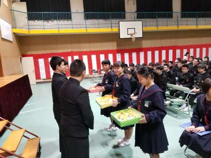 毎年、卒業式前日に行う『コサージュ贈呈式』で初めて三年生に披露されました。卒業生は、それを左胸に差して卒業式にのぞみました。