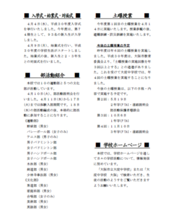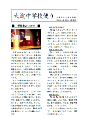 今年度の第1号は、4月に着任した「学校長あいさつ」、「入学式 ・始業式 ・対面式」、「部活動紹介」、「土曜授業」についての記事を掲載しています。ぜひ、ご一読ください。