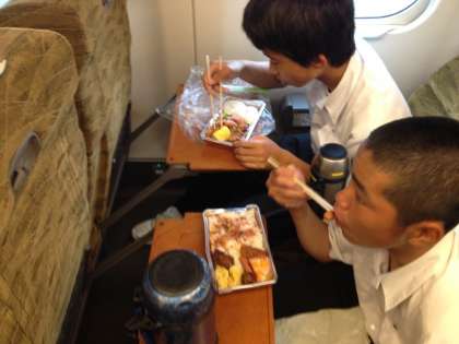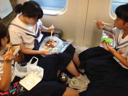新幹線は、予定どおり運行されています。先程、博多駅を通過しました。九州は曇天です。昼食を食べています。