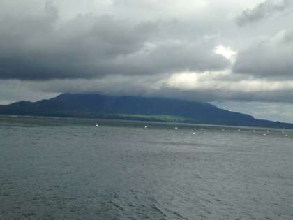 有村溶岩展望所に着きました。天候は、梅雨の曇り空です。記念の学級写真を撮りました。