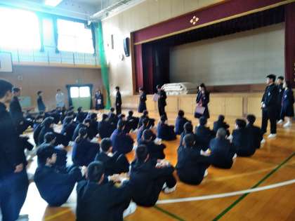 今日は、24日から行う職場体験学習についての説明がありました。職場体験学習では、3クラスの生徒が、ご協力いただける26の事業所でお世話になります。生徒たちは、職場体験がより有意義なものとなるように、これまでに、ハローワークの方のお話を伺ったり、正しい言葉遣いなどを学習したり、事前学習に取り組んでいます。。