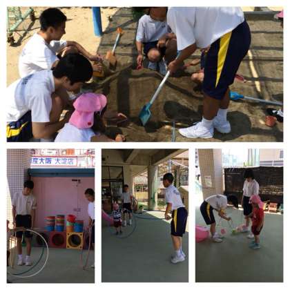生徒たちは、3歳児の園児たちと手遊びなどをして緊張をほぐしてから、園庭へ行き、お砂場遊び、フラフープ遊び、おにごっと、おままごとなどして楽しみました。
