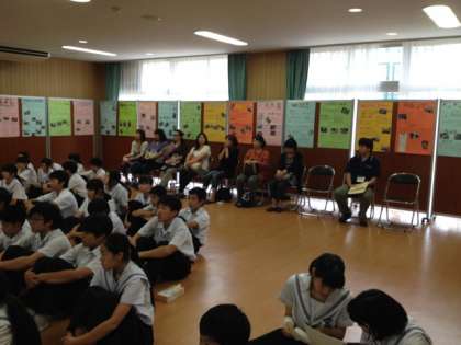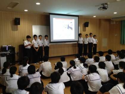 2年生を対象に実施した職場体験の報告会を、ご協力いただいた事業所の皆様、保護者の皆様にもご出席いただき開催しました。生徒たちが体験した内容を掲示物としてまとめ、パワーポイントを使って事業所ごとに発表しました。報告者は、働くことの厳しさ、人と人とのふれあいやコミュニケーションをとることの大切さ、社会におけるルールやマナー、将来に向け学ぶことの意味等、様々な内容について発表していました。