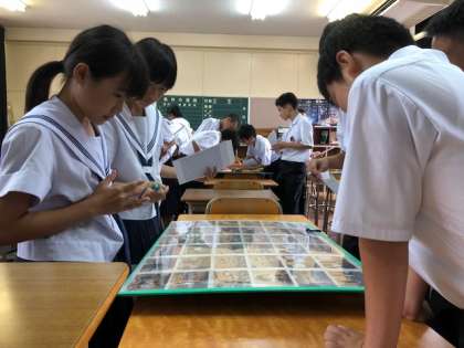 1年生は終学活後、各クラスごとに一泊移住の写真を見ています。購入する人は7月18日19日に、申し込み封筒にお金を入れて持ってきてください。