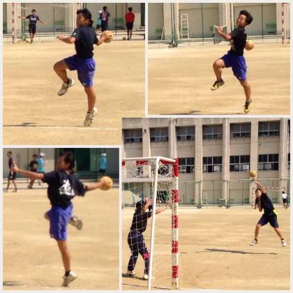 ハンドボール部は、部活動指導員の先生に見守られてシュート練習。