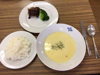 ライス、コーンポタージュ、ハンバーグを調理調理しました。