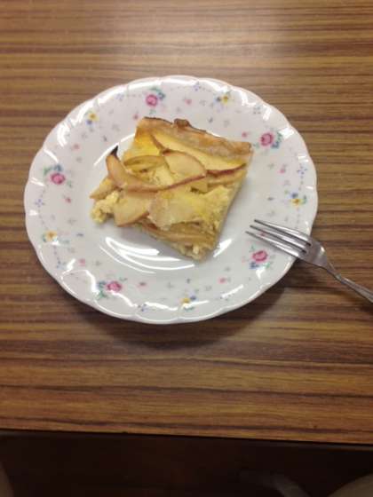 22日は、リンゴのデザートキッシュ、チーズパイを作りました。リンゴのデザートキッシュは、リンゴをうすく切るのが大変苦労しました。チーズパイでは、パイ生地を型にはめることが大変でした。パイ生地を使用したことで時間短縮となりました。(写真:リンゴのデザートキッシュ)