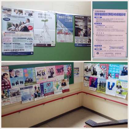 3年生の教室に向かう階段の踊り場には、高校のポスターがたくさん掲示されています。その一角に「大阪府育英会予約奨学生の募集について」のポスターを掲示しました。