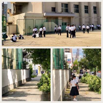 台風の影響で散乱したゴミや木の枝、葉っぱや銀杏の実を全生徒で手分けして片づけました。