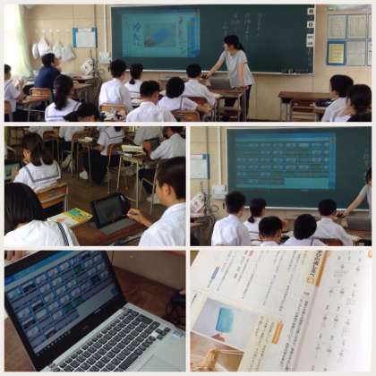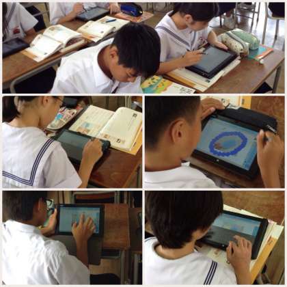 生徒たちは、タブレットを小学校でも、また、中学校入学後も数学などの授業で使用してきたこともあり、先生の指示を守りながらタブレットを使って課題に取り組んでいました。