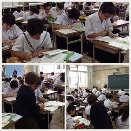 生徒たちは、落ち着いて、そして、集中して「漢字のしくみ『熟語の読み』」の学習に取り組み、先生は一人ひとりのノートを丁寧に点検し、声をかけながら教室を回っていました。