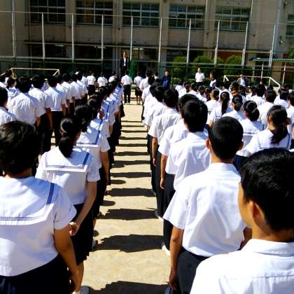 夏の暑い時期は体育館で行っていましたが、今回から運動場で全校集会をします。