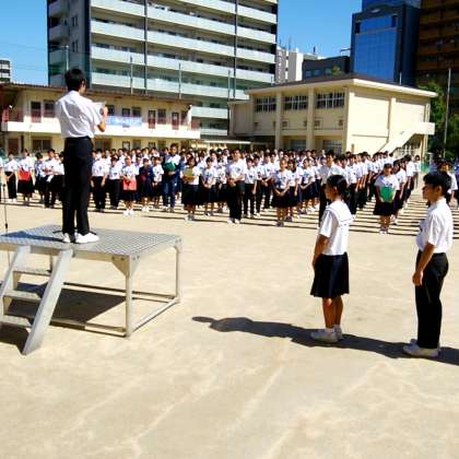 集会では、選挙管理委員会から後期生徒会役員選挙の告示がありました。今週中に立候補受付をし、17日に選挙をします。
