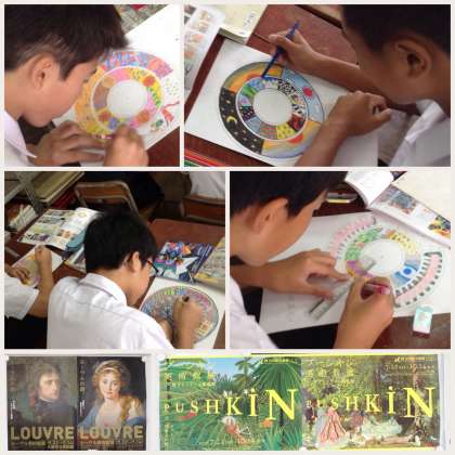 美術の2年生の授業では、作品づくりが進み、26日(金)の文化祭で展示される予定です。生徒一人ひとりの個性が表れている十人十色の作品が仕上がっています。先生からは、美術展の楽しみ方のお話もありました。職員室前には近くで開催されている美術展のリーフレットが掲出されています。