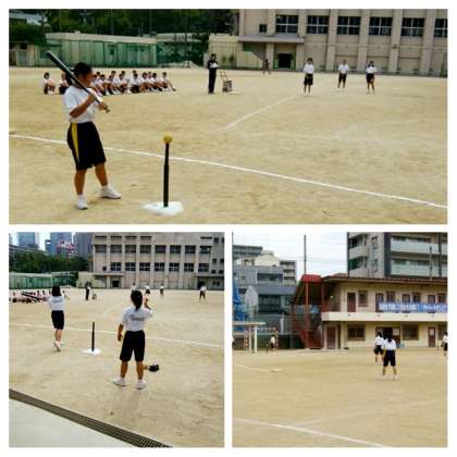 写真のようにボールを置いてバッティングの練習をしています。止まっているボールを打つことは、簡単そうに見えて難しいようです。バットで打つときも、グローブで捕るときも、ボールをよく見てプレーするよう指導しています。