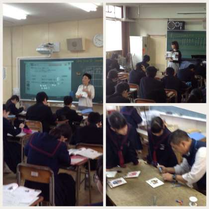 土曜授業、2年生の2時間目。1組技術(写真右下)、2組英語(写真左)、3組音楽(写真右上)。保護者の方が参観される中、いつも通りの授業が進められました。技術の授業では、作品の完成が近づいてきました。