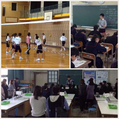 土曜授業、1年生の2時間目。1組社会(写真右上)、2組体育(写真左上)、3組理科(写真下)。保護者の方が参観される中での授業でしたが、生徒たちは普段通り授業に取り組んでいました。2組の体育は、男女共修でバレーボールに取り組みました。