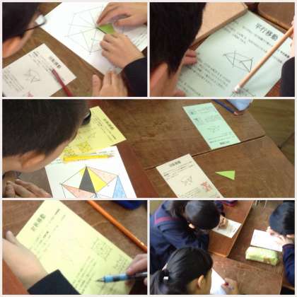 1年生の数学の授業では、ジグソー学習というスタイルで図形の移動の学習をしました。