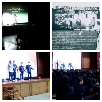 劇公演「ロボットが止まるまでの物語」を、体育館で鑑賞しました。映像と歌による無言劇です。途中のパントマイム体験では、生徒3人がステージで教わりました。演じられたパフォーマー・ダンサーが夢や目標について語る時間があり、生徒にとっては自らの進路や目標に向けて考える機会にもなりました。
