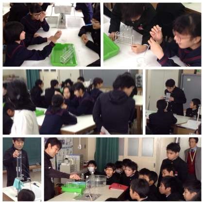 理科室で実験に取り組む1年生の授業の様子です。この授業では「光・音・力による現象」について、テンポよく繰り広げられる先生の様々な演示実験の後、生徒たちが「試験管笛」をつくる生徒実験が行われました。アクティブラーニングの手法も取り入れ、音楽科との教科横断的授業が展開され、50分の内容とは思えない中身の充実した時間となりました。