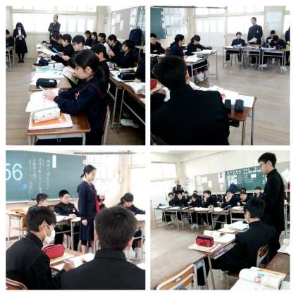 昨日のホームページに掲載した学級とは異なる学級で、今日も「討論ゲーム 論理で迫るか、感情に訴えるか」の単元の授業をしました。生徒たちは積極的な姿勢で授業を受け、しっかりと話を聞き、発言できていました。