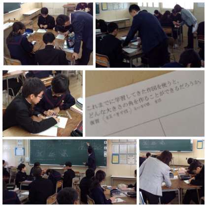 1年生の数学の授業では、これまでに学習した内容を活用しての応用問題に挑戦。グループごとに意見交換し解決に向けて集中して取り組んでいました。