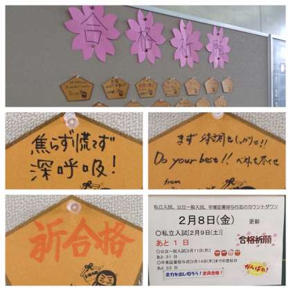教室の掲示物には、先生からのメッセージ「合格祈願」「まずは体調をしっかりと!Do your best!!ベストを尽くせ」「焦らず慌てず深呼吸!」。また、今晩は早く床に就き、明日は早起きし、朝ごはんをしっかり食べて、受験に挑むよう生徒に話をしました。
