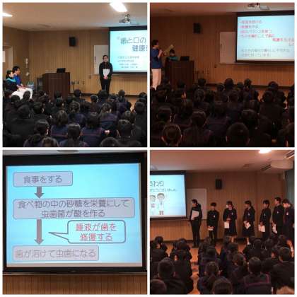 歯の役割、乳歯と永久歯、虫歯のでき方、虫歯の予防方法、ブラッシングの仕方などの説明に加えて、「なぜ乳歯と永久歯があるのか」「寝ている間の口の中の環境は」という生徒からの質問にも答えていただき、有意義な時間となりました。