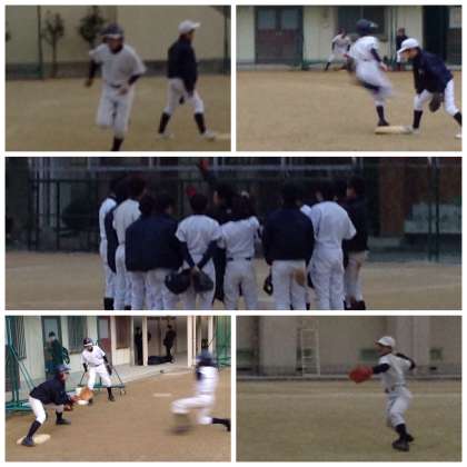 野球部は、限られた施設、グランドを工夫して活用し、部活動を行っています。今日は、週に1回の全面が使用できる日。生徒たちは、試合を想定して、外野手と内野手との連携プレーを繰り返し練習していました。また、走者になった選手は、素早くベースを駆け抜けスライディングし、相手のタッチをかいくぐる練習です。練習の途中では、顧問の先生から審判の立場でプレーの解説を聞き、大人でも難しいルールの説明を聞いていました。
