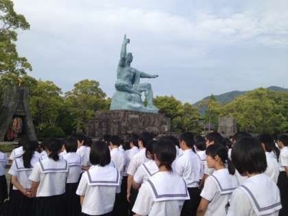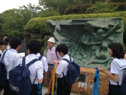 生徒が考えた平和宣言文を読み上げ、鶴を捧げまし