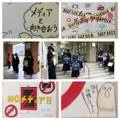 25日(月)から3日間のノーメディア期間。一人ひとりがメディアとの向き合い方を考えるチャンスになりました。SNSなどによるトラブルから身を守るためにも、マナーを守り、家族とも使い方を話し合ってメディアを使うよう指導しています。