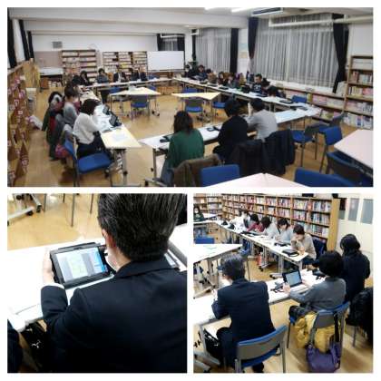 リノベーションが進む図書館(ラーニング・コモンズ)で、PTA実行委員会を行いました。一人1台のタブレットに資料を提示し、協議は仮想のペーパーレス会議で行いました。また、第二部として、タブレットを活用した理科の授業を体験していただきました。