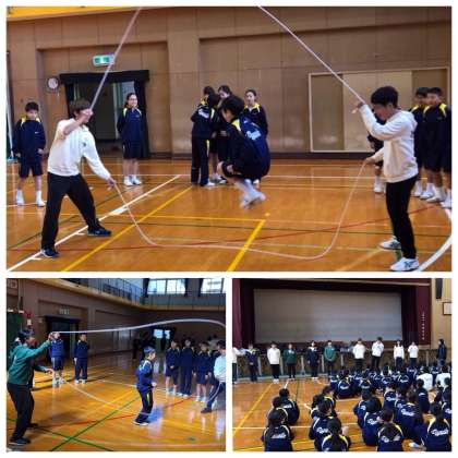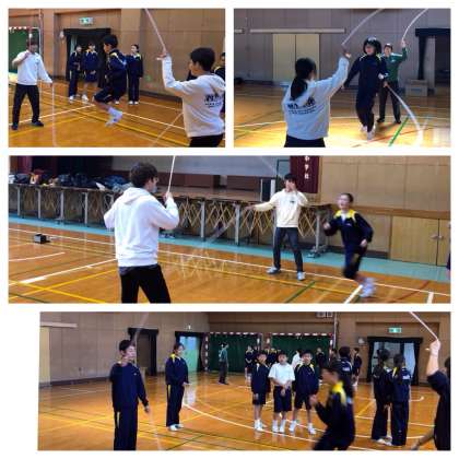 京都大学のサークルMTTRの皆さんに講師をお願いし、体育の授業で1年生がダブルダッチに挑戦しました。大学生の励ましや巧みに縄を回してくれるおかげで、楽しいひと時を過ごしました。