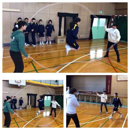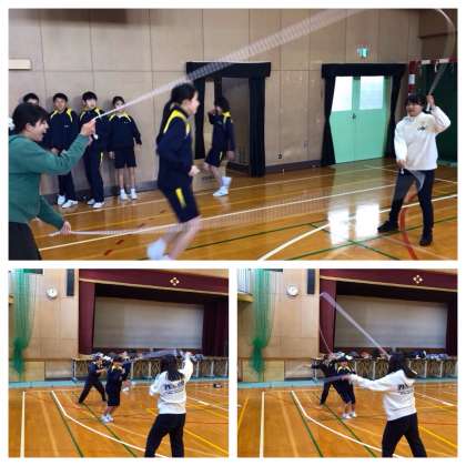 運動の得意な生徒も苦手な生徒も、学生さんたちの励ましの言葉かけと笑顔に引っ張られて、楽しい時間を過ごすことができました。ダブルダッチは、生徒たちにとって、体力づくりの取組のみならず、大学生との交流を通して、ちょっと未来の自分の姿のモデルをイメージする時間でした。