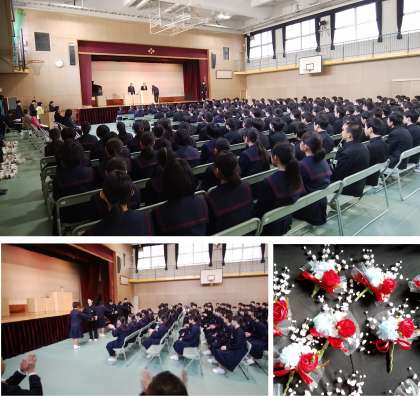 予行後、コサージュ贈呈式をしました。先月、PTA成人教育委員や地域の方にお手伝いいただいて作ったコサージュ。卒業生への思いを込めて、2年生から3年生にコサージュを渡しました。
