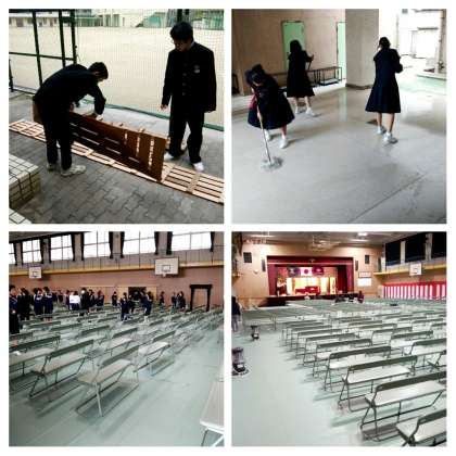 午後は、1年生の一部生徒と2年生全員で式準備をしました。きれいに整えられた式場で、明日、卒業式を行います。