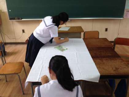 本校では今月26日(金)に体育大会を予定しています。昨日より「応援練習」として、放課後に各学級で当日の応援の練習や旗づくりのための時間が設けられています。写真は3年生の旗づくりのようすです。今はまだ、白い布に下絵を描いているところです。